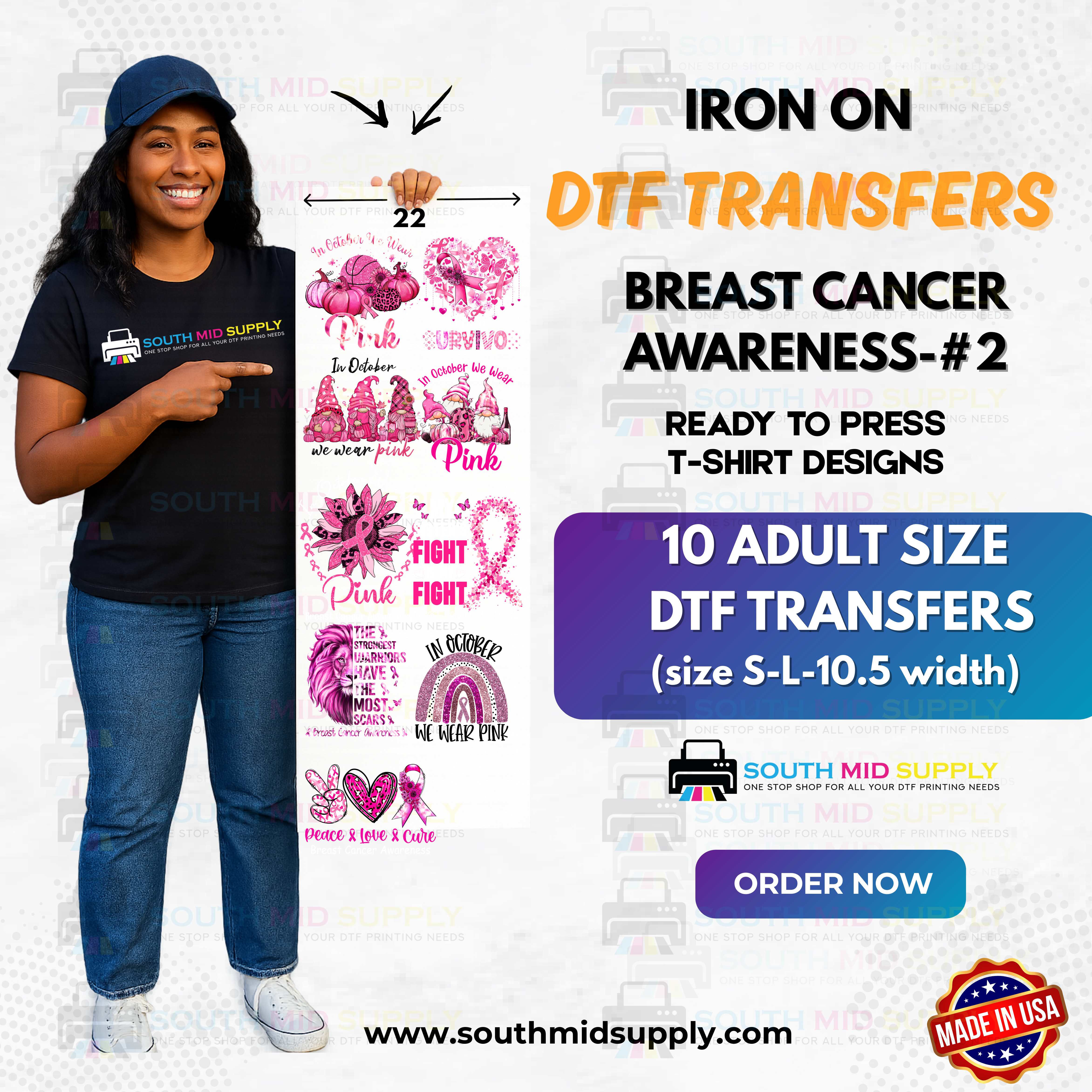 Celebrate strength and resilience with the Breast Cancer Awareness Bundle #2. This set includes 10 high-quality adult DTF transfers, each measuring 22 inches, featuring powerful Survivor and Fighter typography designs. Ideal for customizing apparel to honor and support those impacted by breast cancer, these durable transfers apply easily and display vibrant, lasting prints. Perfect for advocates, survivors, and supporters looking to make a meaningful statement.