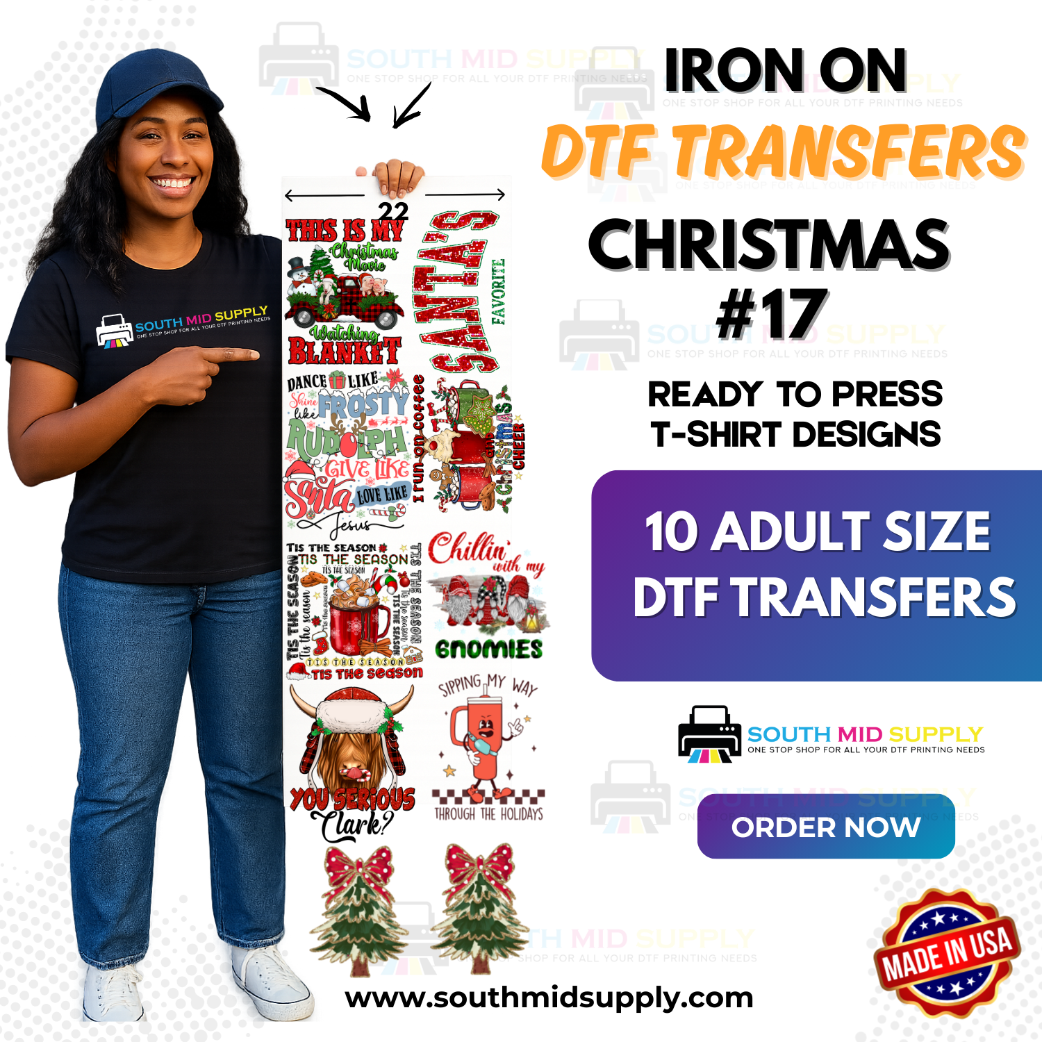 Rustic holiday set with farmhouse charm: trucks with trees, barn silhouettes, gingham accents, and distressed “Noel/Believe” scripts.