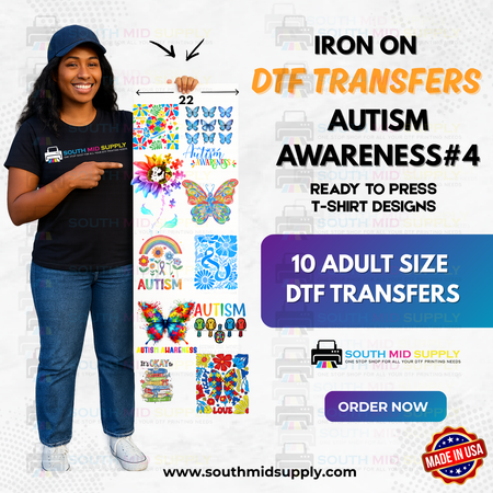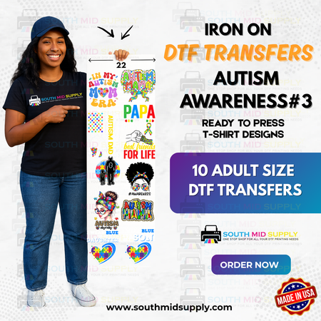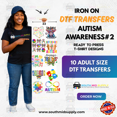 Rainbow puzzle pieces, hearts, ribbons, “Autism Awareness,” “Support • Advocate • Include.”
