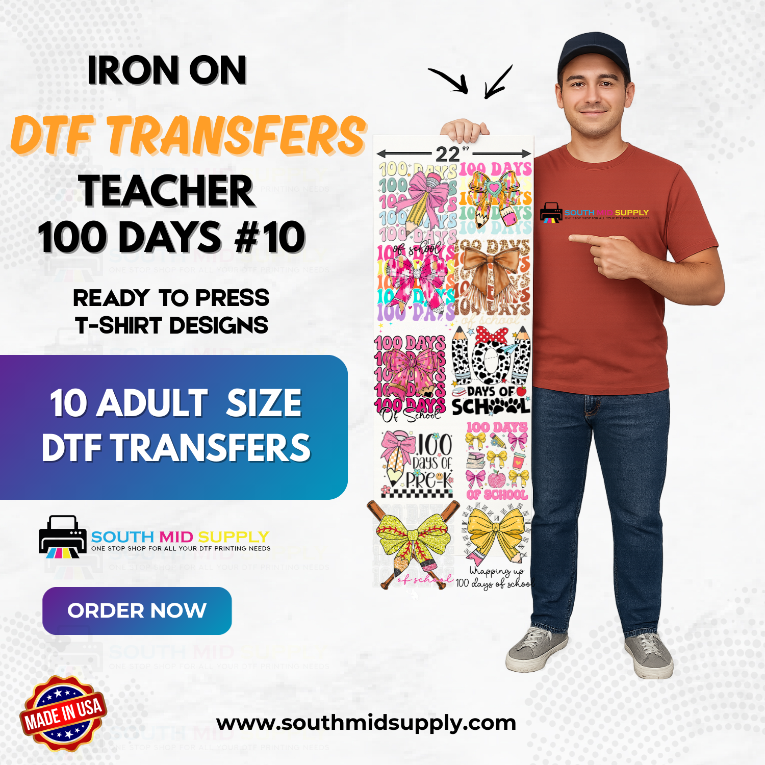 Celebration-ready graphics sized for adult shirts: “100 Days Smarter,” “Teaching 100 Days in a Row,” “Elementary Squad,” confetti, crayons, and fun badge layouts that pair with colorful cardigans.
