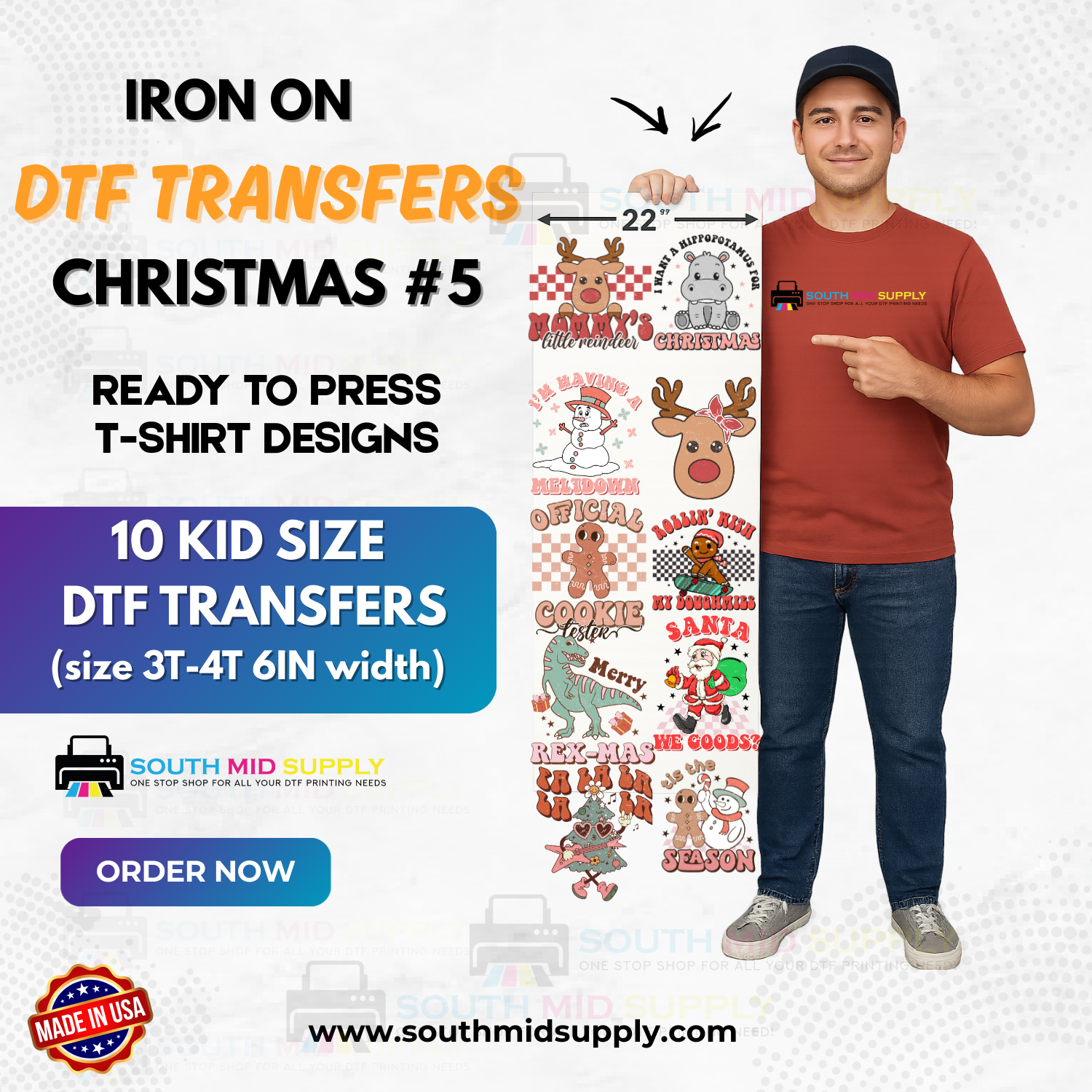 Family-friendly art sized for adult tees but perfect for matching sets: smiling Santas, gingerbread buddies, candy canes, and playful “Ho-Ho” type.