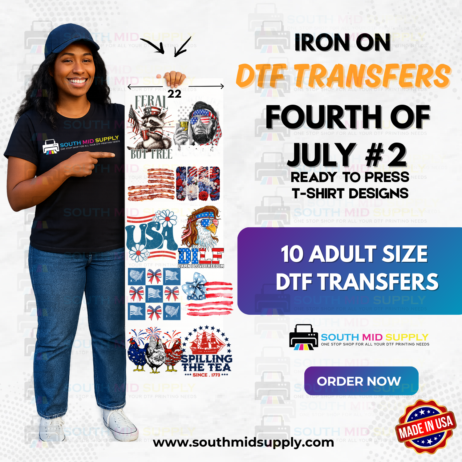 Same as Bundle #1 (10 adult transfers; 295–305°F, 10–15s, medium–firm; peel per film; post-press 5–8s). Cold wash; low dry. 2 PM cutoff • ready 5 PM.