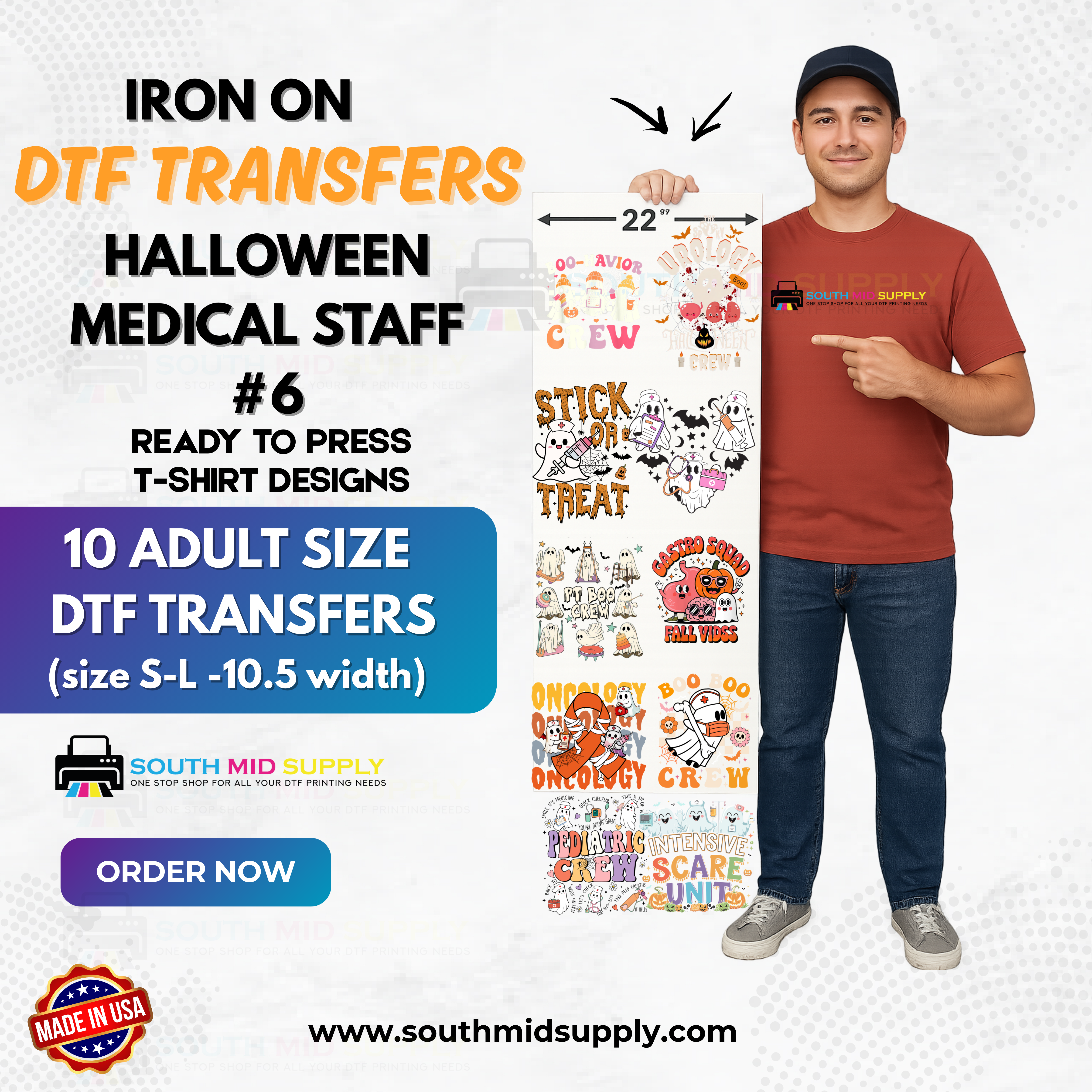 Celebrate spooky season on the unit with this Halloween Medical Staff bundle—10 ready-to-press adult transfers themed for nurses, techs, and providers. Fun, department-friendly designs (think “Stick or Treat” for IV/Phlebotomy, Boo-Boo Crew for ER/Trauma, Pediatrics Crew, Oncology Crew, and the Intensive Scare Unit) make it easy to outfit the whole team.