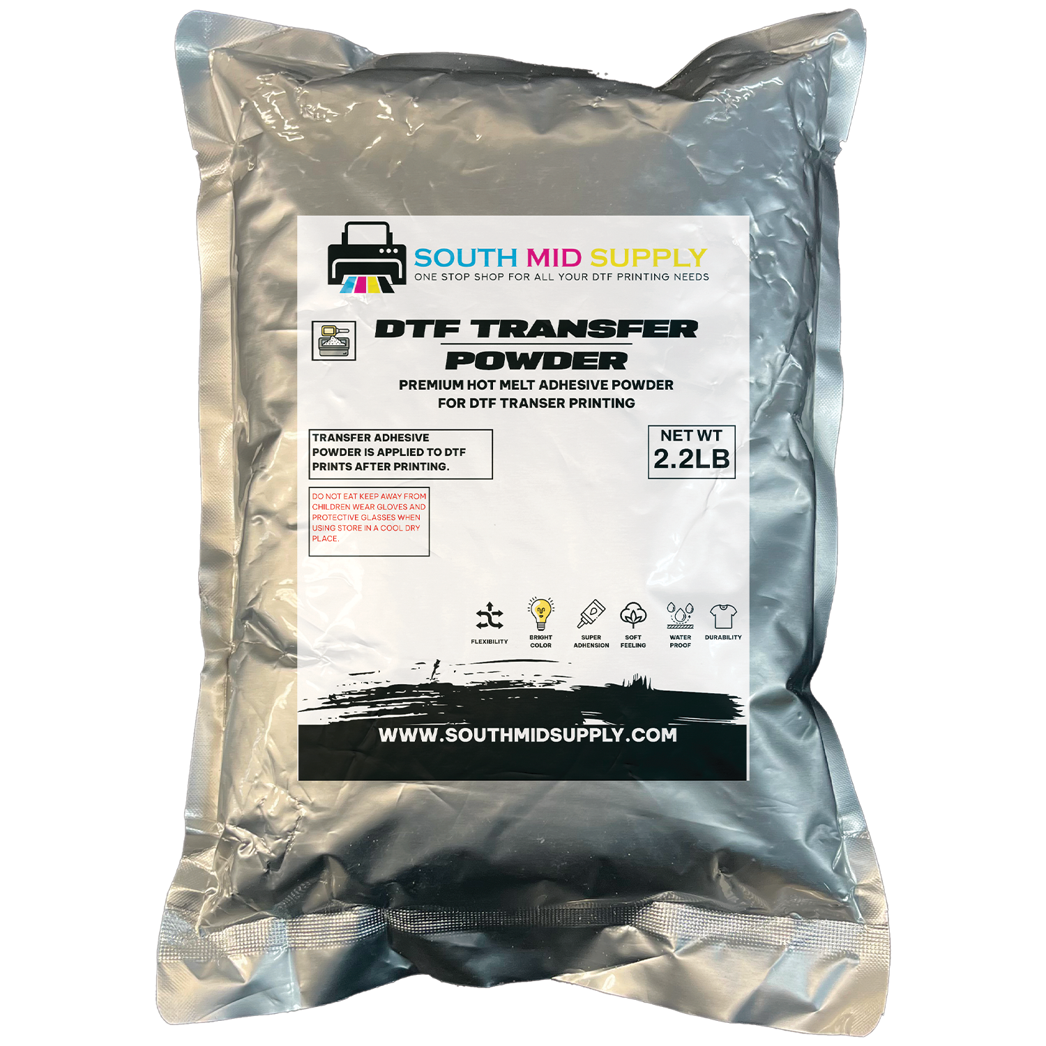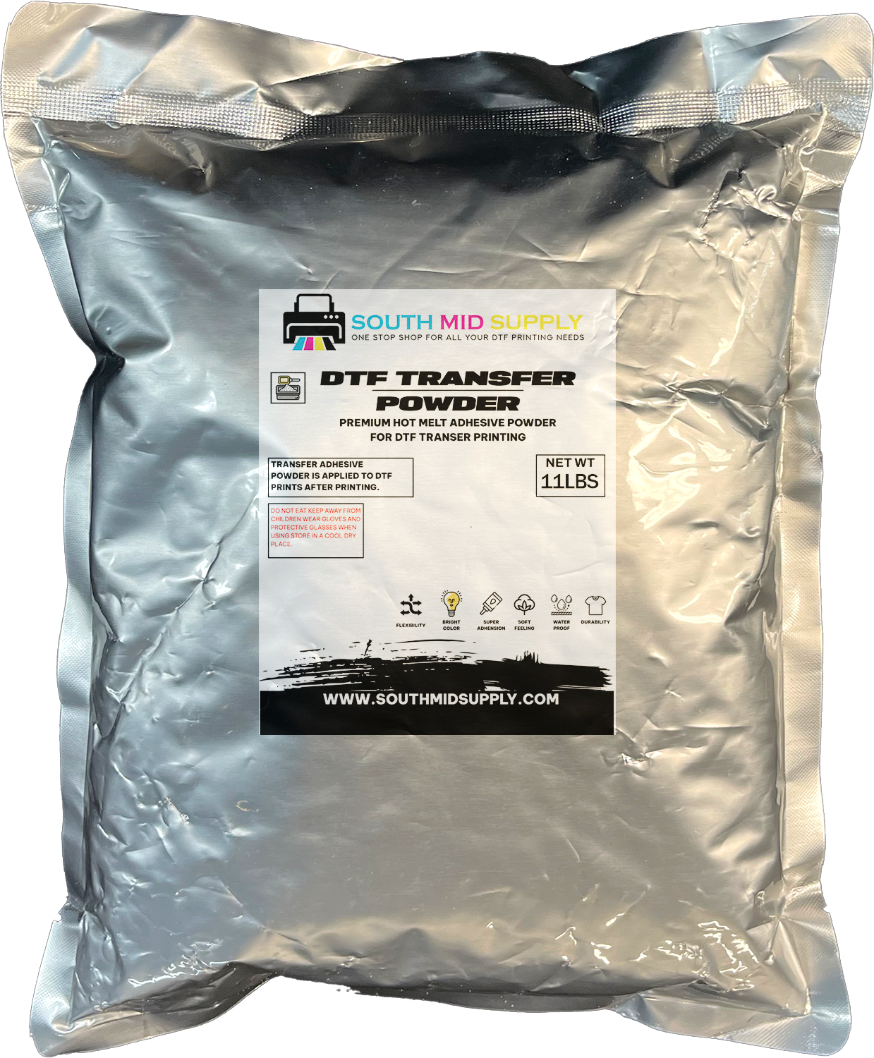 Transfer adhesive powder is applied to DTF prints after printing.