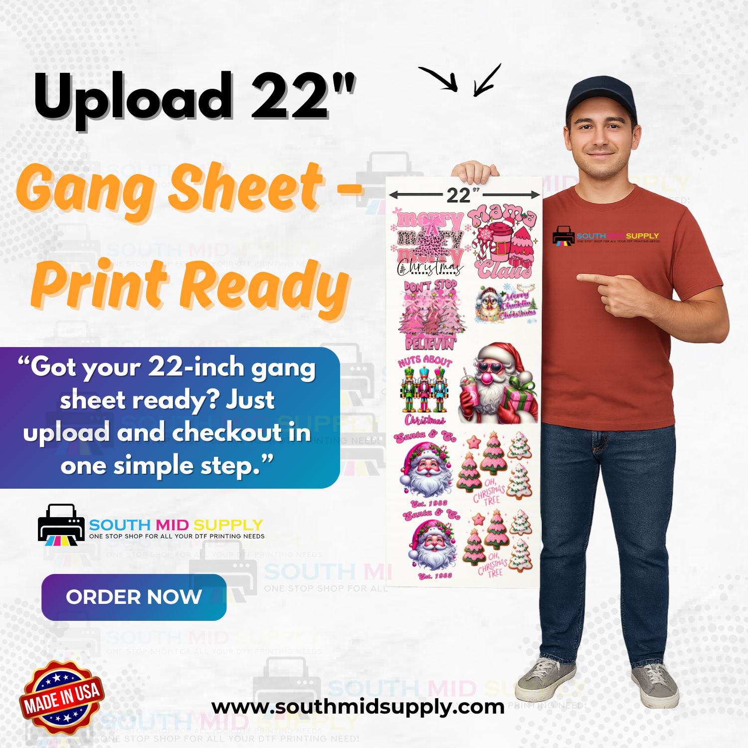 Already have your designs laid out? Simply upload your 22" gang sheet, and we’ll print it as a premium hot peel double matte DTF transfer. Save time, maximize your sheet space, and get ready-to-press transfers delivered fast.