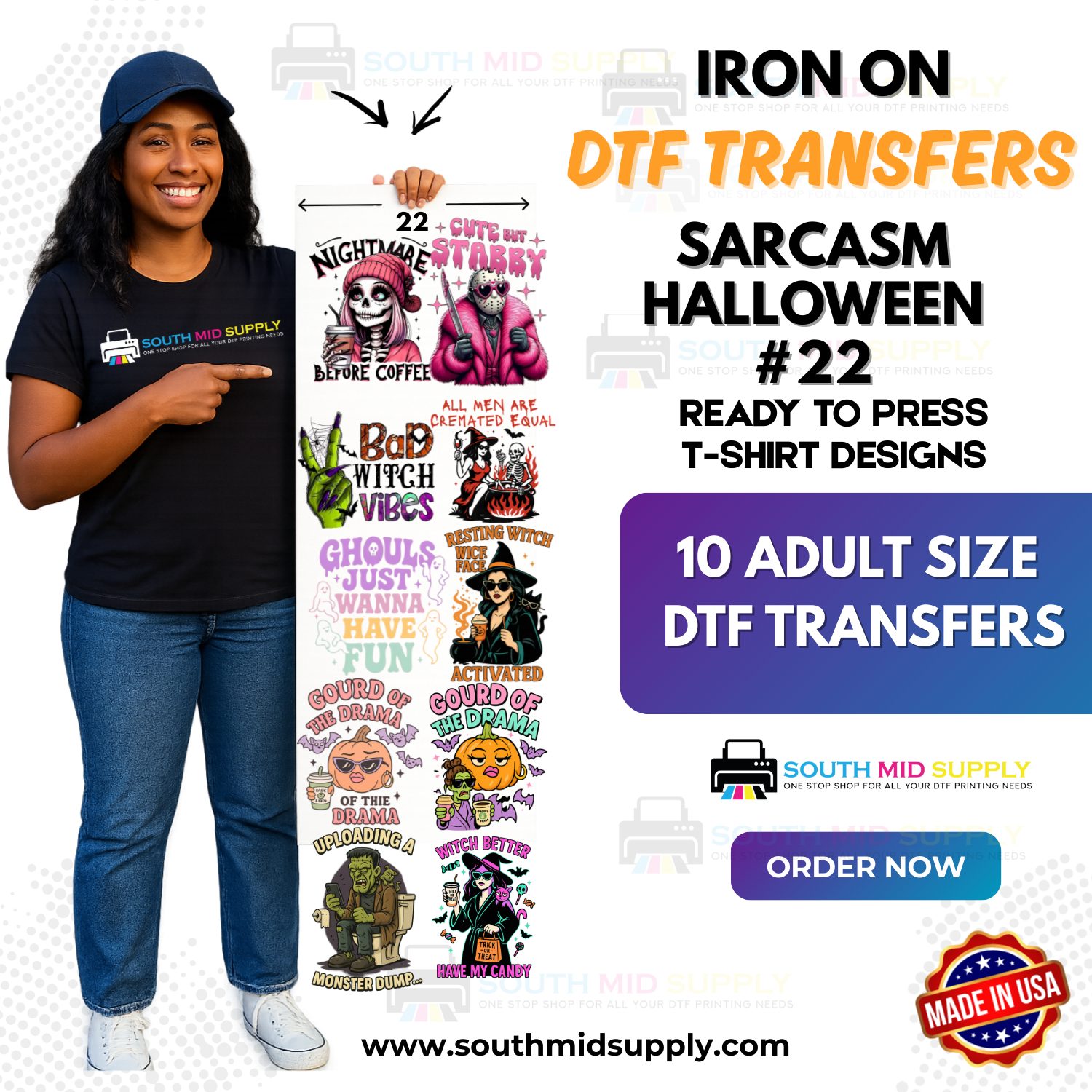 A crowd-pleasing set of darkly funny Halloween designs—clean iconography, punchy one-liners, and retro-horror cues that look premium on black, charcoal, and mineral-wash blanks.